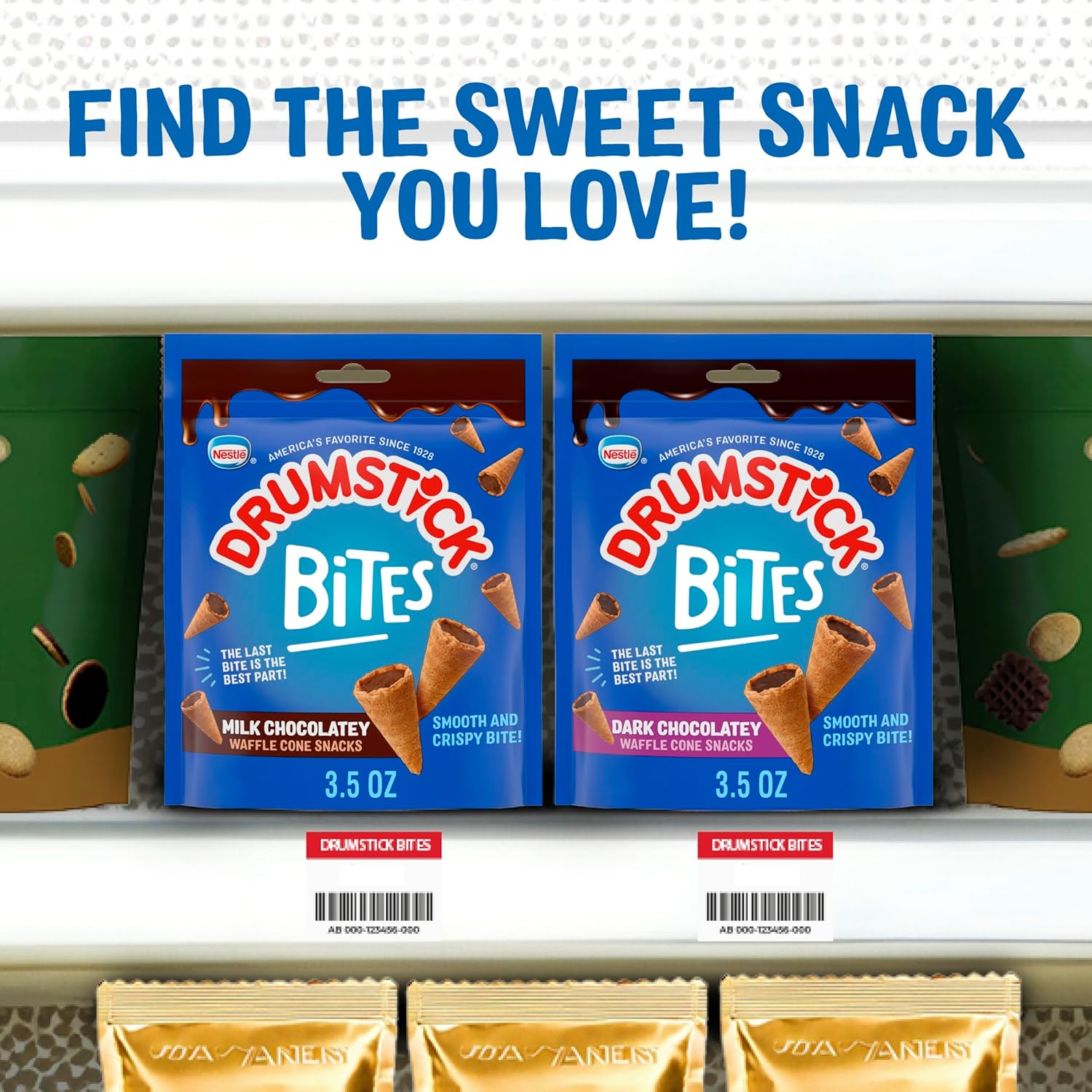 Drumstick took the best part of the waffle ice cream cones — the chocolatey bottom — and made it the whole snack. No more waiting for the last bite. These Milk Chocolatey Waffle Cone Snacks feature a chocolatey lining and that legendary nugget tucked into a crispy sugar cone, it’s sweet-meets-crunch perfection in every sweet treat. Enjoy them straight from the packet or pair with your favorite ice cream for quick DIY sundae bowls. Drumstick Bites are portioned for peak convenience and ready to go straight from the pantry to your taste buds. Share the bag with friends or enjoy them as a perfect post-lunch, after school snacks, or anytime you’re digging through your pantry snacks looking for something chocolatey.