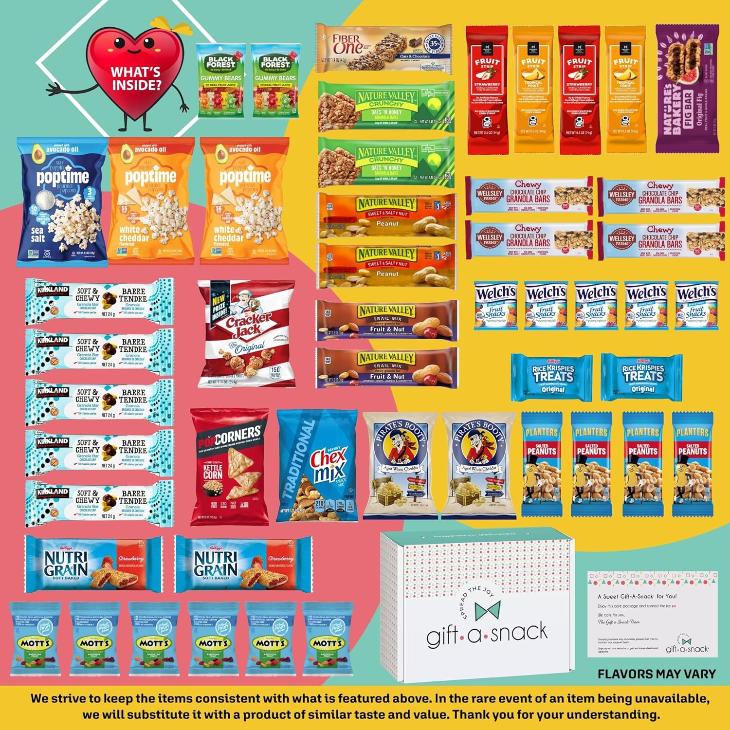 Gift A Snack – Valentines Day Healthy Snack Box Care Package + Greeting Card (50 Count) Birthday Treats Gift Basket, Nutritious Granola Breakfast Bars Office Food Assortments & Variety Gifts