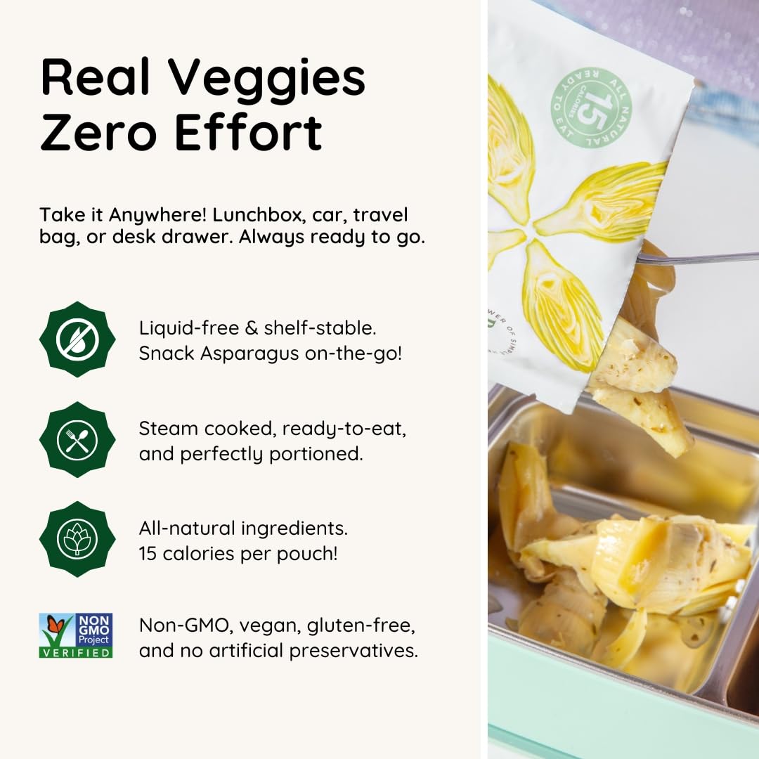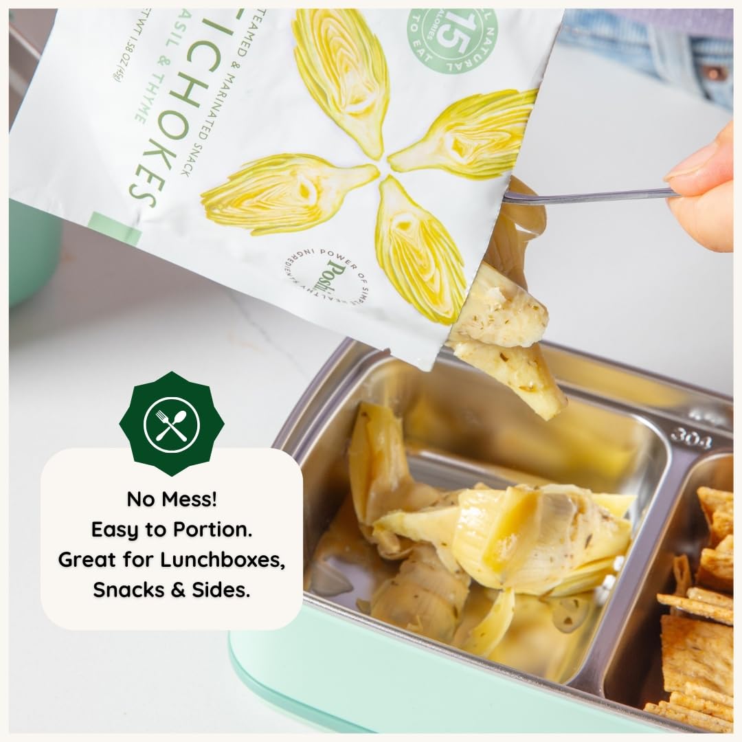 Comes in easy-to-carry pouches that keep your artichoke hearts fresh & delicious. It's the perfect low calorie guilt-free snack on-the-go!