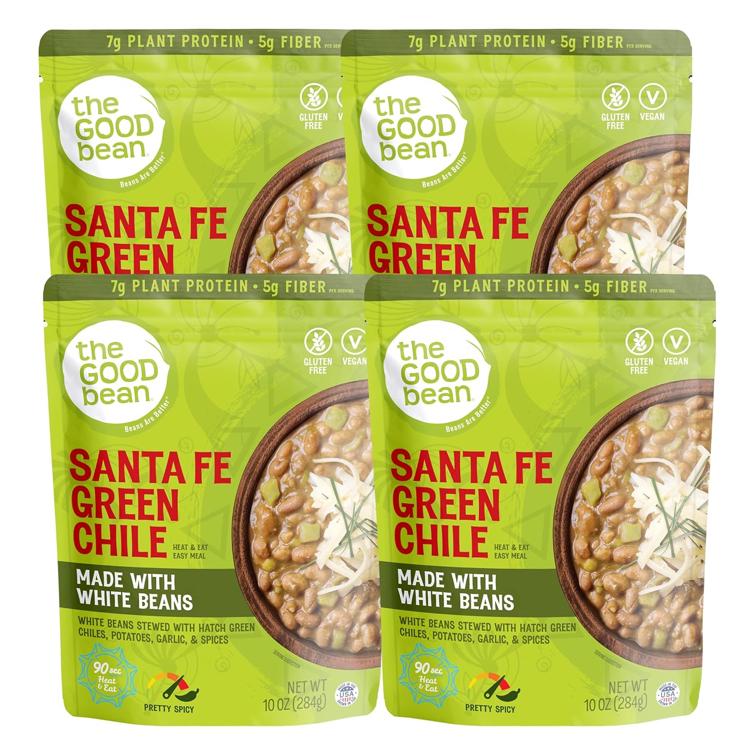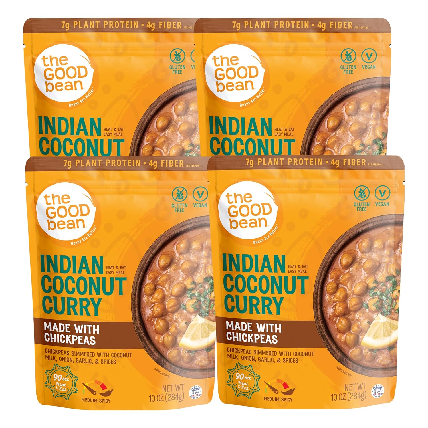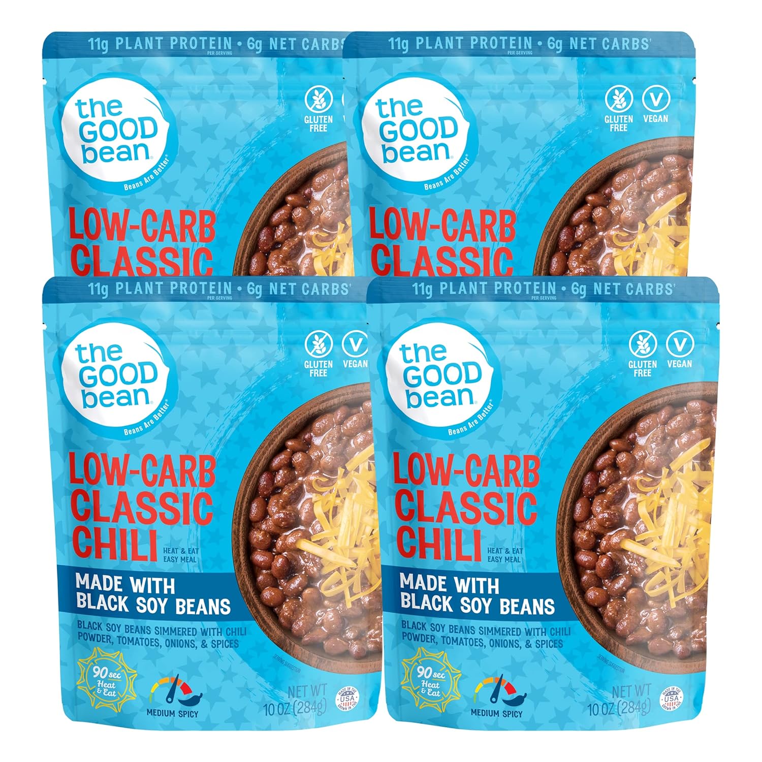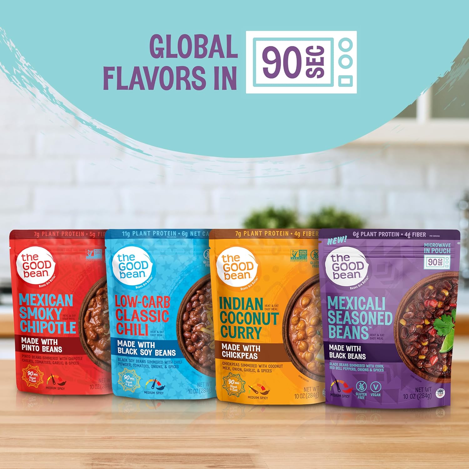 The Good Bean Heat and Eat Pouch – Variety Pack – (Pack of 4) 10 oz Pouch – Mexican Smoky Chipotle, Low-Carb Classic Chili, Mexicali Seasoned Beans, and Indian Coconut Curry